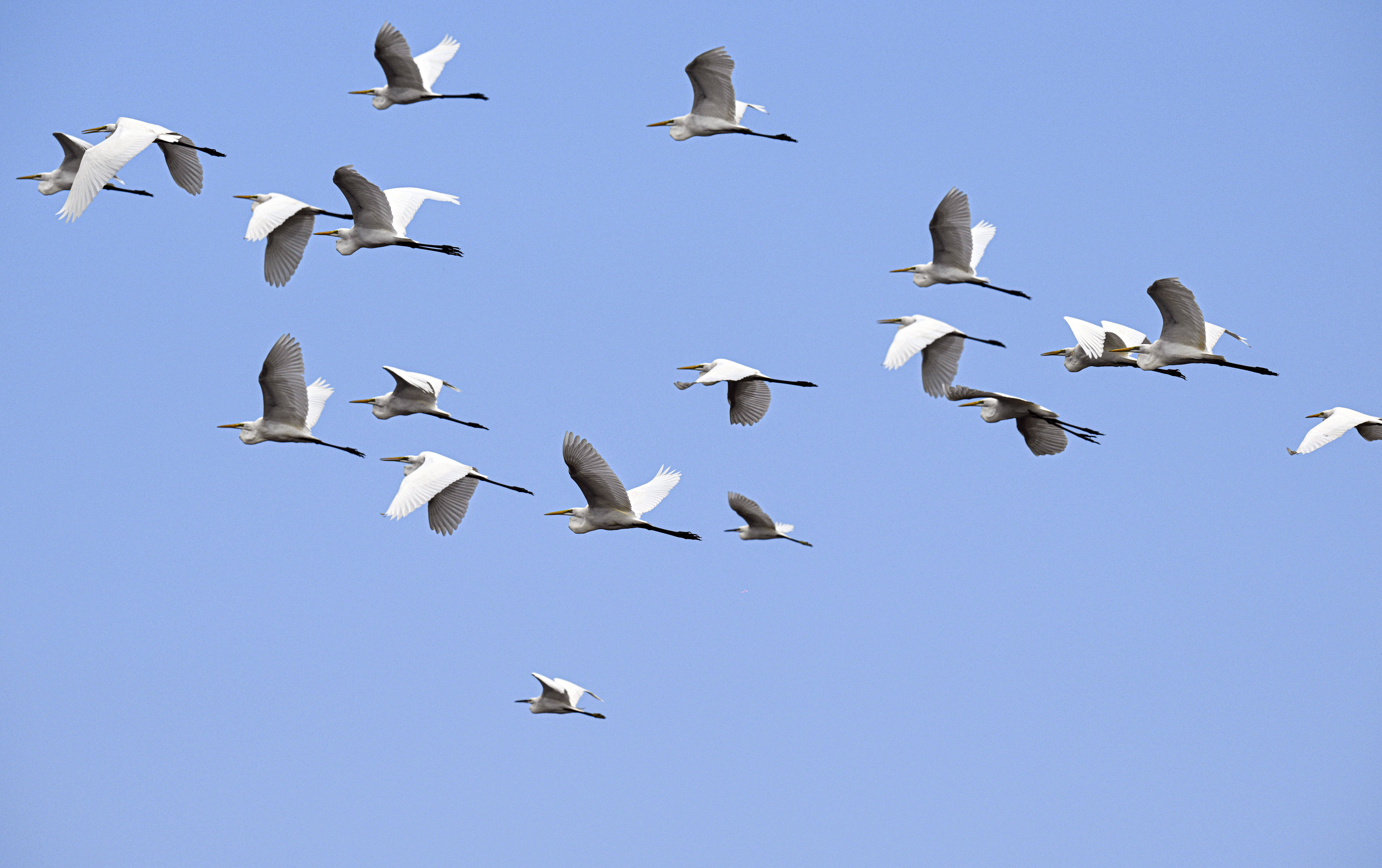 10月2日,成群的鹭鸟飞翔在海南昌江海尾国家湿地公园上空。