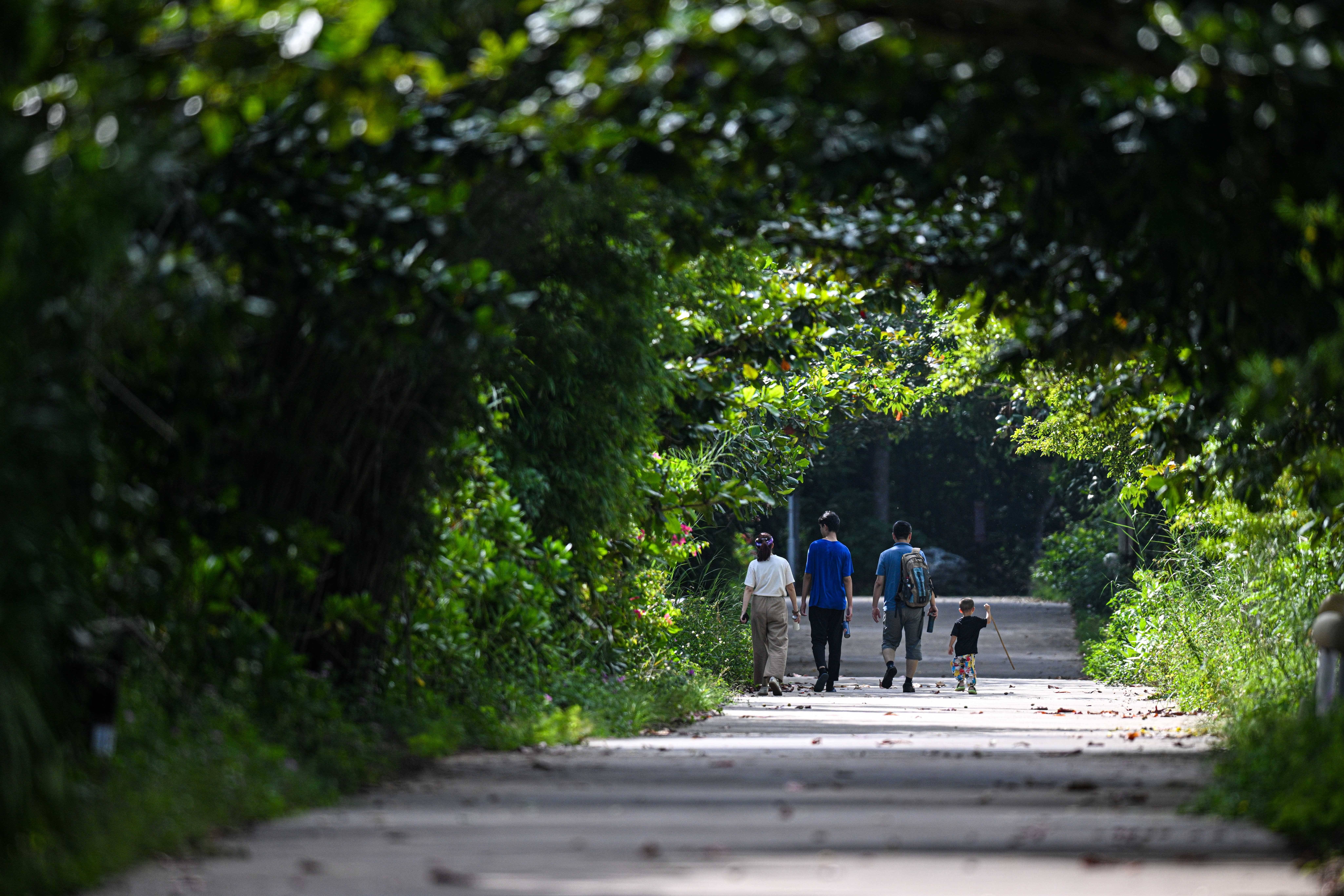 10月3日,游客在海南昌江海尾国家湿地公园游玩、拍照。