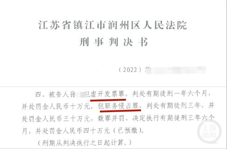镇江市润州区人民法院判决书显示,出生于1987年的孙某曾是当地一家公司财务经理。2021年9月3日,孙某因涉嫌职务侵占罪主动投案,同年10月1日被取保候审;2023年2月24日,孙某因犯虚开发票罪、犯职务侵占罪,被润州区人民法院判处有期徒刑三年六个月,并处罚金四十万元;2024年5月28日,镇江市中级人民法院作出了维持原判的二审判决。同案人朱某也因虚开发票罪、单位行贿罪被判处有期徒刑8年。