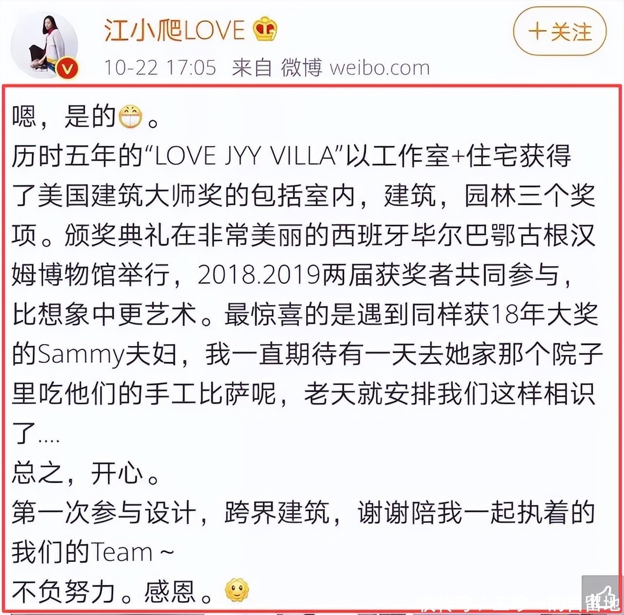 2019年10月,江一燕在网上炫耀自己拿到了“美国建筑师大奖”。