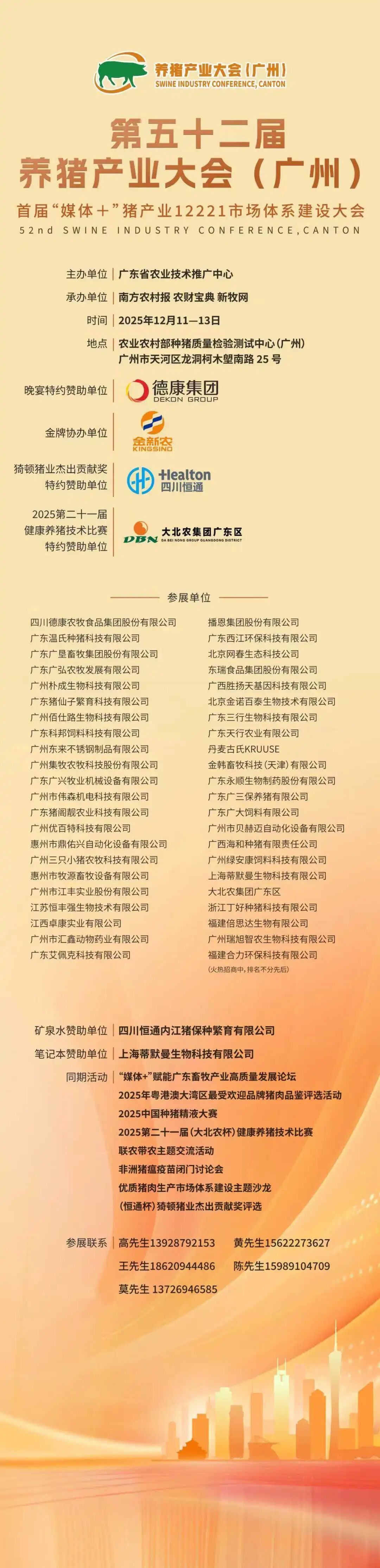 2025年12月11-13日,第五十二届养猪产业大会(广州)暨首届“媒体+”猪产业12221市场体系建设大会将于广州柯木塱农业农村部种猪质量检验测试中心隆重召开。