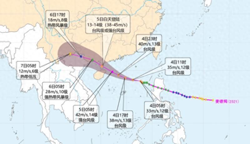 据中央气象台10月4日消息,今年第21号台风“麦德姆”4日凌晨加强为台风级,中心附近最大风力有12级(33米/秒),中心最低气压为975百帕,七级风圈半径300-380公里,十级风圈半径80-100公里。预计,“麦德姆”将以每小时25-30公里的速度继续向西偏北方向移动,强度逐渐增强,并将于5日白天在广东电白至海南万宁一带沿海登陆。预计登陆时强度为台风级或强台风级(13~14级,38~45米/秒),登陆后强度逐渐减弱。