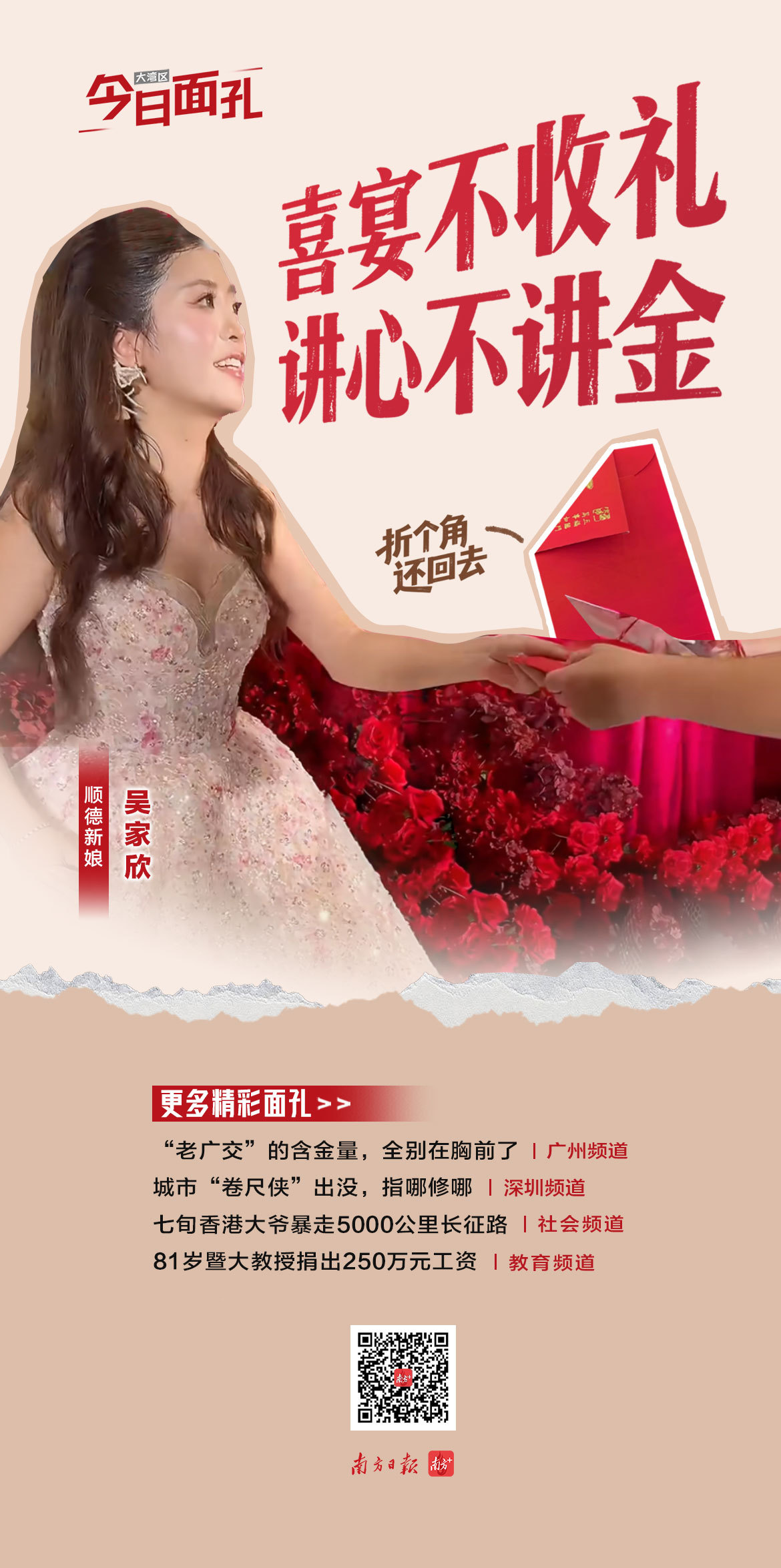 新娘吴家欣出生于普通职工家庭,她表示不收红包并非家里经济条件优越,而是源于顺德“重相聚轻礼金”的传统,“我从小跟着父母出席婚宴,大家都是这样做的。所以朋友把视频发给我的时候,我才知道外地的网友对这个习俗赞不绝口。”情意金不换>>
