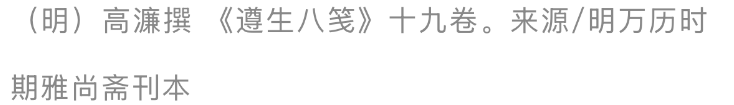 但这依旧不是高濂人生的全部。在《遵生八笺》中,他的研究涉及“居室运用,游具品物,宝玩古器,书画香草花木之类”诸多方面,且有独到的、自成一家的见解。在《清修妙论笺》中,他畅议论释、道高论;在《四时调摄笺》中,他阐发顺应阴阳节序之法;在《起居安乐笺》中,他探讨日常的养生智慧;在《延年却病笺》中,他传授疾病治疗的良方;在《饮馔服食笺》中,他记录如何越吃越健康;在《燕闲清赏笺》中,他品鉴赏玩器物……如此点点滴滴,记录的不是高濂的学识,更多是他对生活中闲情雅趣的珍视。