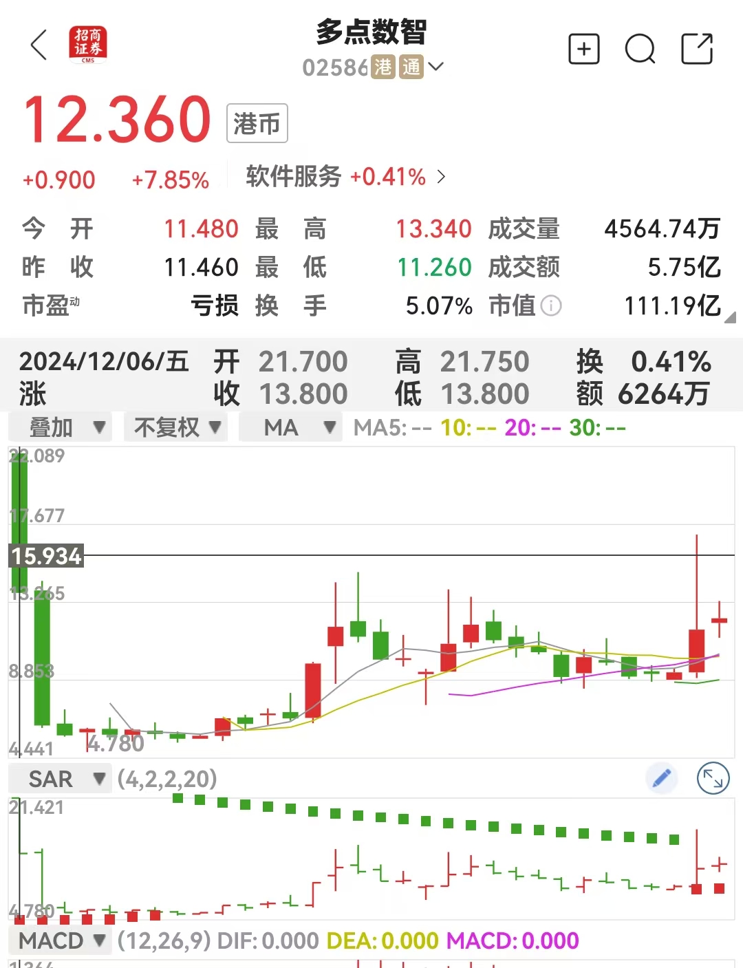 消息发出,适逢京东(09618)、蚂蚁集团等申请香港稳定币牌照,多点数智以10.36港元/股跳空高开,最高达17.10港元/股,涨幅近90%;当日收于11.14港元/股,涨幅23.64%。