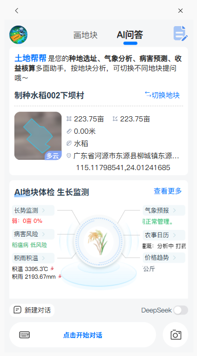 “一套智能新农具”便捷管理:推出移动端AI应用“田间小助手”,深度融合先进AI大模型,提供实时气象、智能问答、病虫害诊断、无人机调度等功能,让手机成为农户的便携管理工具,实现农业生产智能化与精准化。